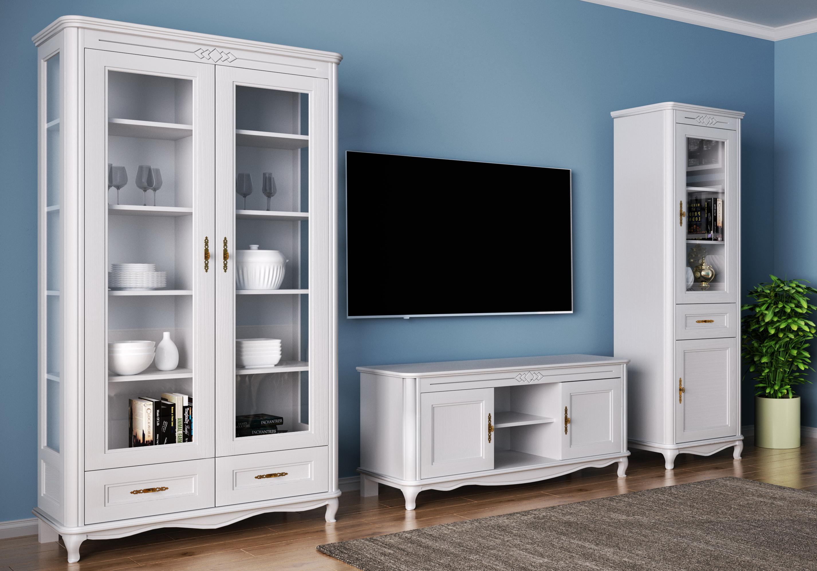 Элегантная гостиная в классическом стиле. Строгие линии набора разбавлены волнообразными элементами, гнутыми ножками, изящной фурнитурой и уникальным рисунком. Он объединяет все изделия коллекции. Мебель сделана с использованием массива и шпона дуба. Светлый оттенок крашения придаёт ей лёгкость и утончённость.